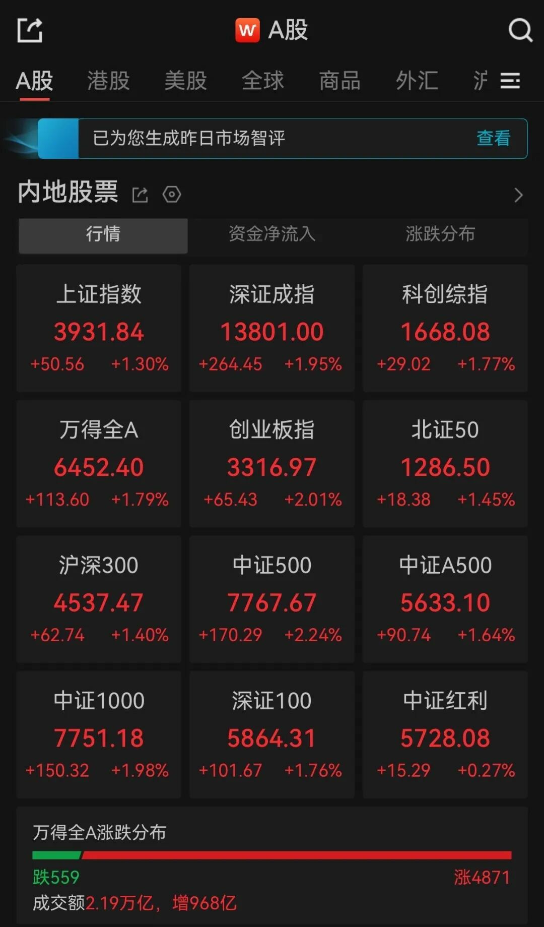 三大指数齐涨 全市场百股涨停 市场热点快速轮动 3月24日,市场全天探底回升,沪指和深成指均涨超1%,创业板指尾盘翻红,此前一度跌近2.5%。黄白线分化明显,微盘股指数大涨超5%。沪深两市成交额达2.08万亿,较上一个交易日缩量3487亿 03-24