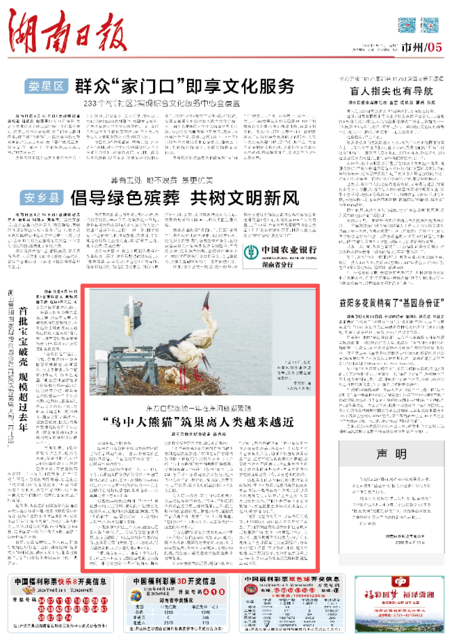 “鸟中大熊猫”筑巢离人类越来越近 信任环境与人 春日的洞庭湖生机勃勃。在湖南东洞庭湖国家级自然保护区岳阳县春风湖外滩,一座20余米高的监控铁塔顶端,一个直径近两米的鸟巢中,东方白鹳正在繁育后代 04-16