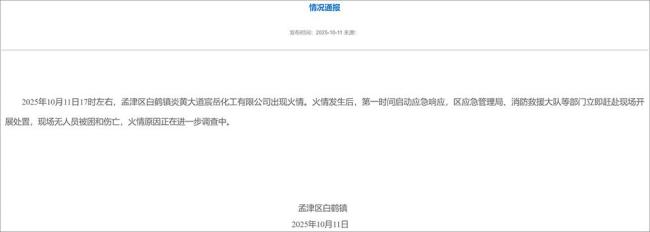 洛阳一化工厂突发大火 无人员伤亡 火情原因正调查 10月11日17时左右,河南省洛阳市孟津区白鹤镇炎黄大道宸岳化工有限公司发生火情。火情发生后,当地政府迅速启动应急响应机制,区应急管理局和消防救援大队等部门立即赶往现场进行处置 10-13