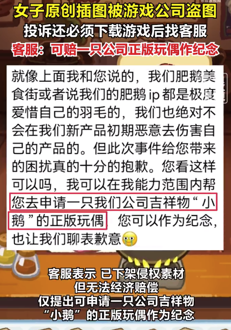 女生被游戏盗图过了新手体验才能投诉 商家仅愿赔偿一只玩偶 近日,一女生公开吐槽自己精心制作的图被“肥鹅美食街”盗用。对方不仅改掉配色,还将图中人物换成自家游戏角色,质疑其盗用创意,要求下架作品并公开道歉。女生称,在发现侵权后,本想联系客服投诉,谁料寻找投诉渠道还需先过游戏新手体验,联系上客服后,... 04-23