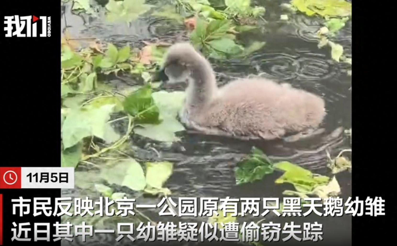 园方回应黑天鹅一家四口中幼雏失踪 已报警并加强监控 11月5日,有市民反映北京一公园内原本有两只黑天鹅幼雏,但最近其中一只幼雏疑似被盗失踪。公园管理处工作人员称,园内原来有一对成年黑天鹅和两只幼雏,发现幼雏失踪后已报警,并正在加装监控设备以预防类似事件再次发生 11-06