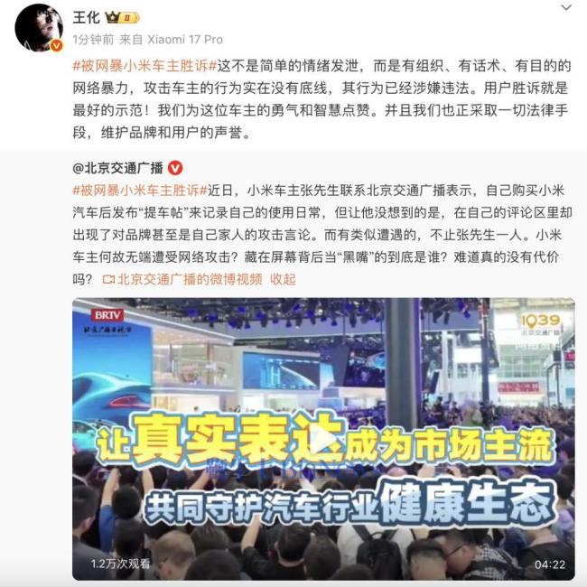 小米王化称攻击车主的行为没有底线 网络暴力需严惩 9月23日,小米集团公关部总经理王化转发了一条关于小米车主胜诉的微博,并表示攻击车主的行为没有底线。他认为这不是简单的情绪发泄,而是有组织、有话术、有目的的网络暴力,这些行为已经涉嫌违法。王化强调,用户胜诉是最好的示范 09-24