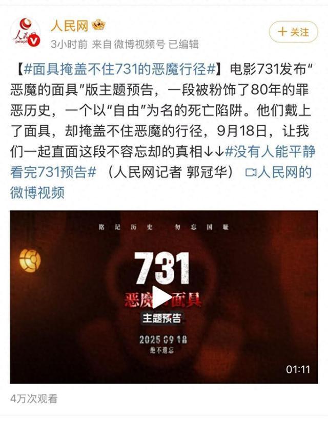 有日本网民呼吁上映731 揭开历史真相 当人民网、央视新闻、新华社这三家国家级媒体共同为电影《731》发声时,这部电影显然不仅仅是一部普通的影片,而是一次对历史真相的庄严捍卫。正当我们期待通过影像揭开历史伤疤时,日本外务省却暗中阻挠,雇佣水军抹黑 09-16