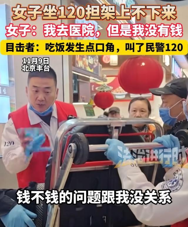 女子与他人发生口角霸座120担架 因没钱拒不下担架 11月9日,在北京的一家餐馆里,一名女子因琐事与其他顾客发生争执。她坐在120担架上拒绝下来,无论工作人员如何劝说,她都坚持说:“我去医院,但是我没钱。”最终,120工作人员告知她的行为已经妨碍了秩序,女子这才从担架上下来 11-10