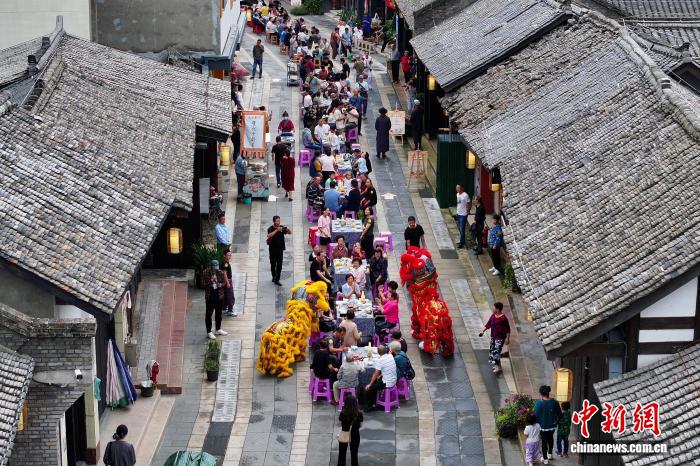 四川眉山太和老镇长街宴引400多食客尝鲜 9月27日,四川省眉山市东坡区太和老镇,随着三声“开宴啰”响起,长街宴正式开席。现场50余张桌子座无虚席,凉拌鸡、东坡肘子、太和鲫鱼等经典菜肴依次上桌,吸引了400多名食客沉浸式体验这场充满烟火气的长街宴。图 09-28