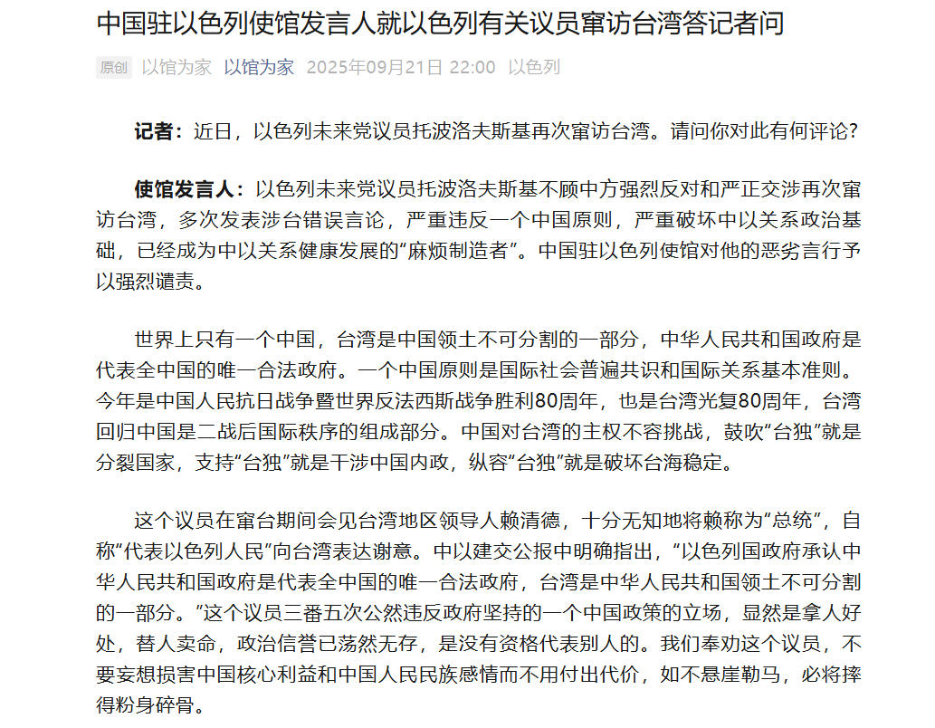 中使馆回应以色列有关议员窜访台湾 强烈谴责恶劣言行 中国驻以色列大使馆微信公众号发布消息,回应了以色列未来党议员托波洛夫斯基窜访台湾的问题。发言人指出,该议员不顾中方强烈反对和严正交涉再次访问台湾,并多次发表错误言论,严重违反一个中国原则,破坏中以关系的政治基础,成为两国关系健康发展的障碍 09-22