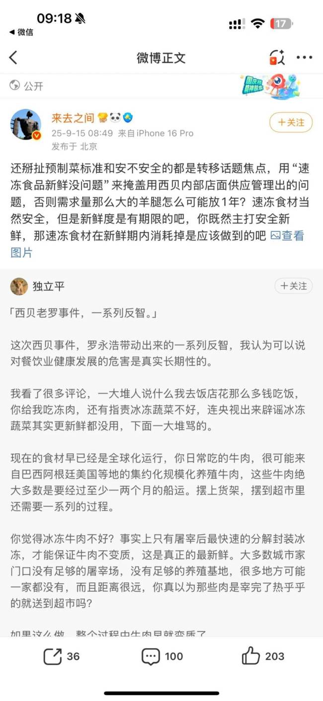 微博CEO批西贝:用速冻食品掩盖供应链问题 争议引发广泛关注 近日,罗永浩与贾国龙之间的争议持续发酵,这场商业领域的“口水战”俨然演变成了一出备受关注的连续剧。就在各方议论纷纷之际,微博CEO来去之间意外介入,通过转发网友观点的方式公开表态,瞬间引发了新一轮的热议 09-16