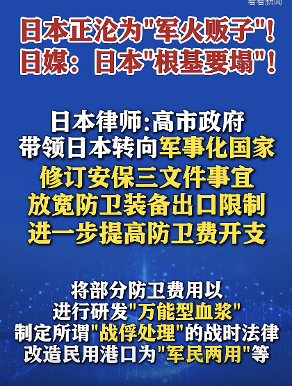 日本国家定位被指面临崩塌风险! 日本国家定位被指面临崩塌风险。据日本《东京新闻》12月2日报道,根据日本首相高市早苗的指示,日本自民党已着手研究修订安保三文件事宜。放宽防卫装备出口限制、进一步提高防卫费开支等政策诉求,已经因为可能导致日本变成“军火贩子”饱受诟病。日本将部... 12-03
