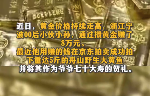00后小伙买黄金赚8万拍下野生大黄鱼 作为爷爷七十大寿加中秋的双重贺礼 近日,浙江宁波00后小伙小孙用买黄金多年赚的8万元拍下一条珍稀的舟山野生大黄鱼,作为爷爷七十大寿加中秋的双重贺礼。据悉,野生大黄鱼价格比养殖黄鱼贵几十倍,该条重达5斤,十分稀有,在市场中和拍卖平台十分罕见。爷爷年轻时曾品尝过野生大黄鱼的鲜美... 09-23