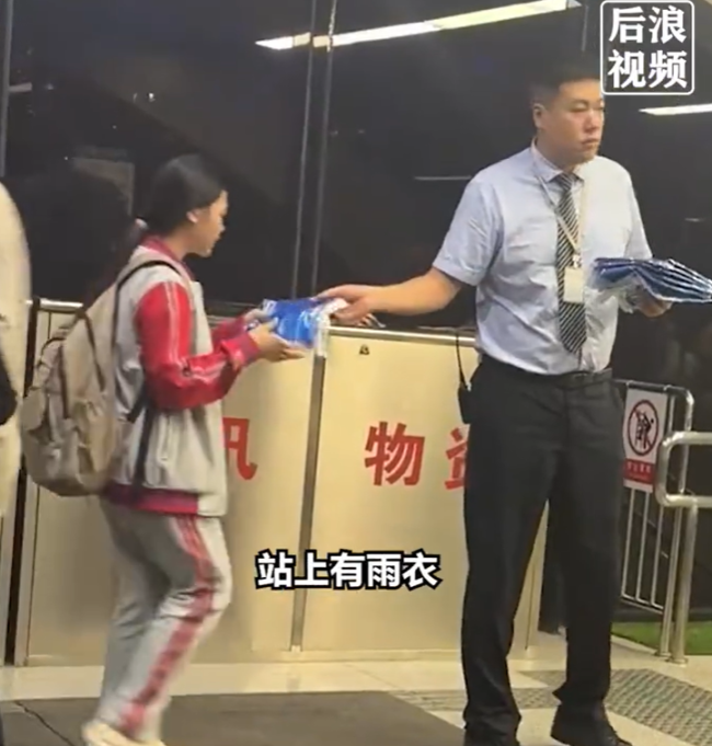 下班遇大雨地铁为乘客免费发雨衣 近日,山东济南。下班高峰突降大雨,地铁工作人员站在地铁口为出站乘客免费发雨衣。济南地铁工作人员称:每站都有储备的雨衣,遇到突降雨的情况乘客可自行去找工作人员拿,有的乘客不知道所以有的站工作人员会站在地铁口去发放。... 09-18