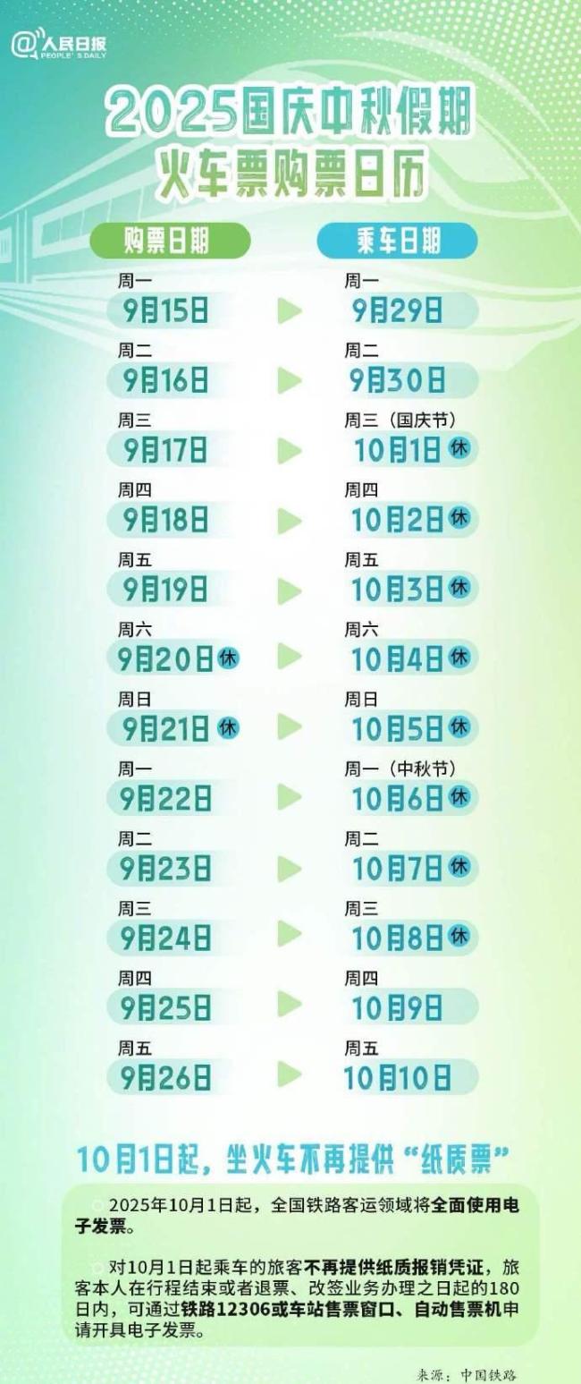 国庆中秋购票4个关键时间 把握抢票时机 国庆中秋假期购票的关键时间如下:9月16日可以购买国庆前一天即9月30日的火车票。9月17日可以购买10月1日国庆节当天的火车票。9月22日可以购买10月6日中秋节当天的火车票。9月24日则可以购买假期最后一天即10月8日的火车票 09-16