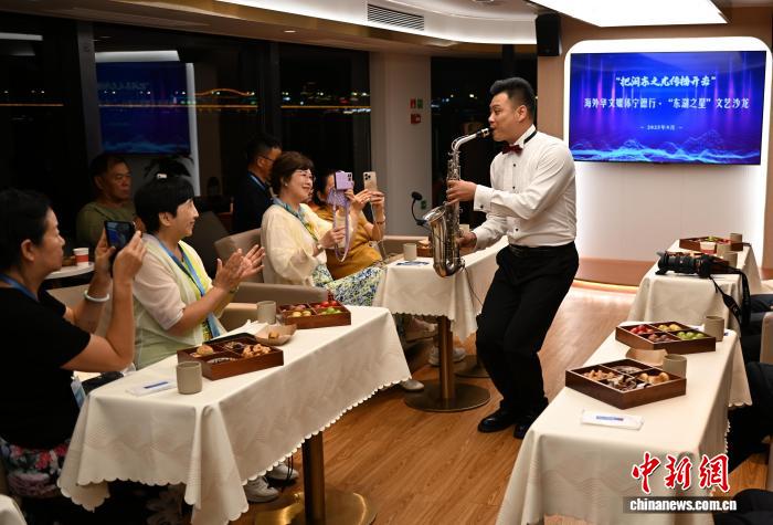 12国16家海外华文媒体参访福建宁德 9月13日晚,“把闽东之光传播开去”——海外华文媒体宁德行活动在福建省宁德市启动,此次活动共有12国16家海外华文媒体代表前来参访。图为“东湖之星”文艺沙龙现场,海外华文媒体代表体验“零碳文旅”、共赏文艺沙 09-15