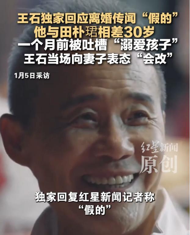 王石回应离婚传闻 再次辟谣 万科集团创始人王石针对网传“王石与田朴珺离婚”的说法,在1月5日晚回复红星新闻记者称这一消息是假的。几小时前,田朴珺也对记者做出了同样的回应,夫妻二人的说法完全一致。这对相差30岁的夫妻自2012年恋情曝光以来一直备受关注 01-07