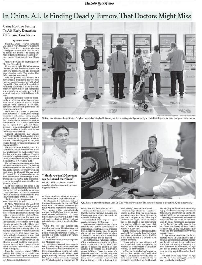 外媒:中美已走上不同AI道路 解决实际问题 当地时间1月2日,美国《纽约时报》发表整版报道,介绍了阿里巴巴研发的胰腺癌早筛AI模型。该模型帮助医生发现了原本可能遗漏的致命肿瘤,挽回了多名患者的生命。这篇报道在美国网友中引起广泛关注,许多人认为这是新兴技术的正确应用 01-07